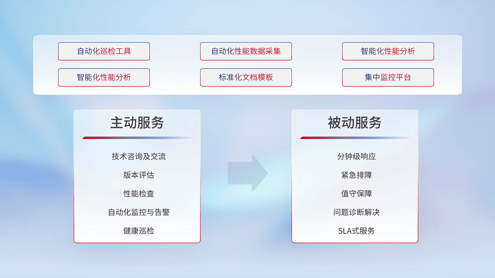 智能化工具和标准化文档,,,,保障服务质量,,提供主动服务(包含技术咨询、、、版本评估、、性能检查、、、、自动化监控与告警、、、健康巡检)和被动服务包含(分钟级响应、、、紧急排障、、、、值守保障、、、、问题诊断解决、、SLA服务)。。。